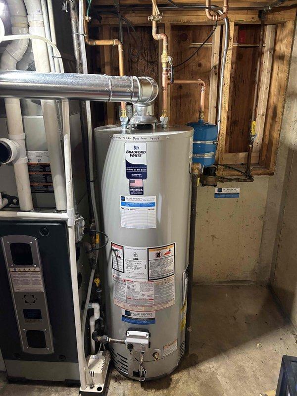 Successfully replaced an 18-year-old water heater with a new 40-gallon natural gas Bradford White unit (model BFRG240T6N) in the basement. Isolated and drained the existing system, removed and disposed of the old water heater, then installed the new unit with expansion tank. Made all necessary modifications to flue piping, gas line connections, and water supply lines to ensure proper operation and code compliance. System tested and verified operational with 6-year tank warranty and 1-year parts and labor warranty coverage.