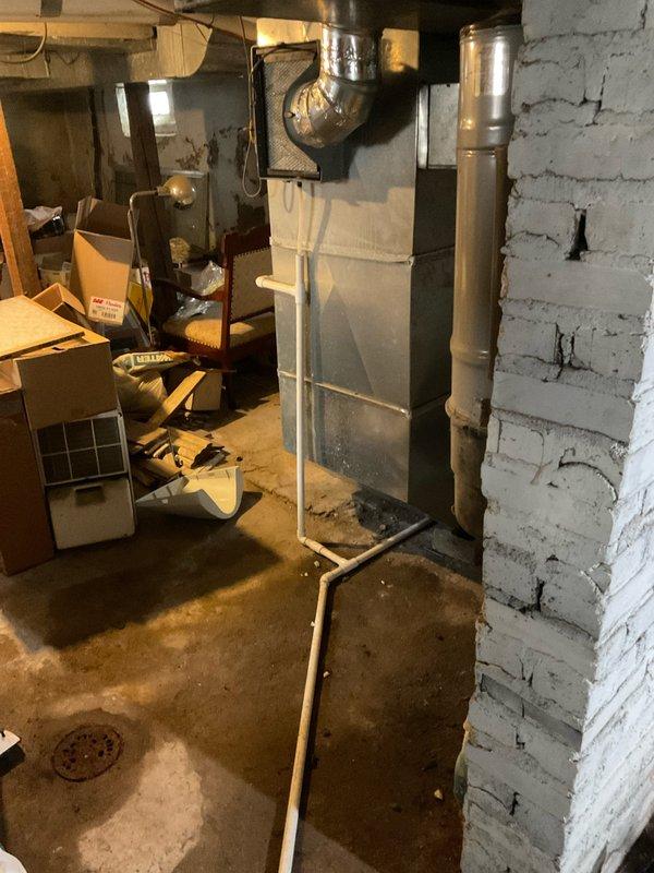Responded to service call regarding suspected humidifier water leak. Upon inspection of basement HVAC system, examined furnace unit and associated ductwork, PVC drainage lines, and humidifier components while unit was operational for heating only. Verified heating system functioning properly with humidifier in off position, confirmed no active water leakage present at time of inspection, and assessed drainage configuration and condensate management system for potential issues.